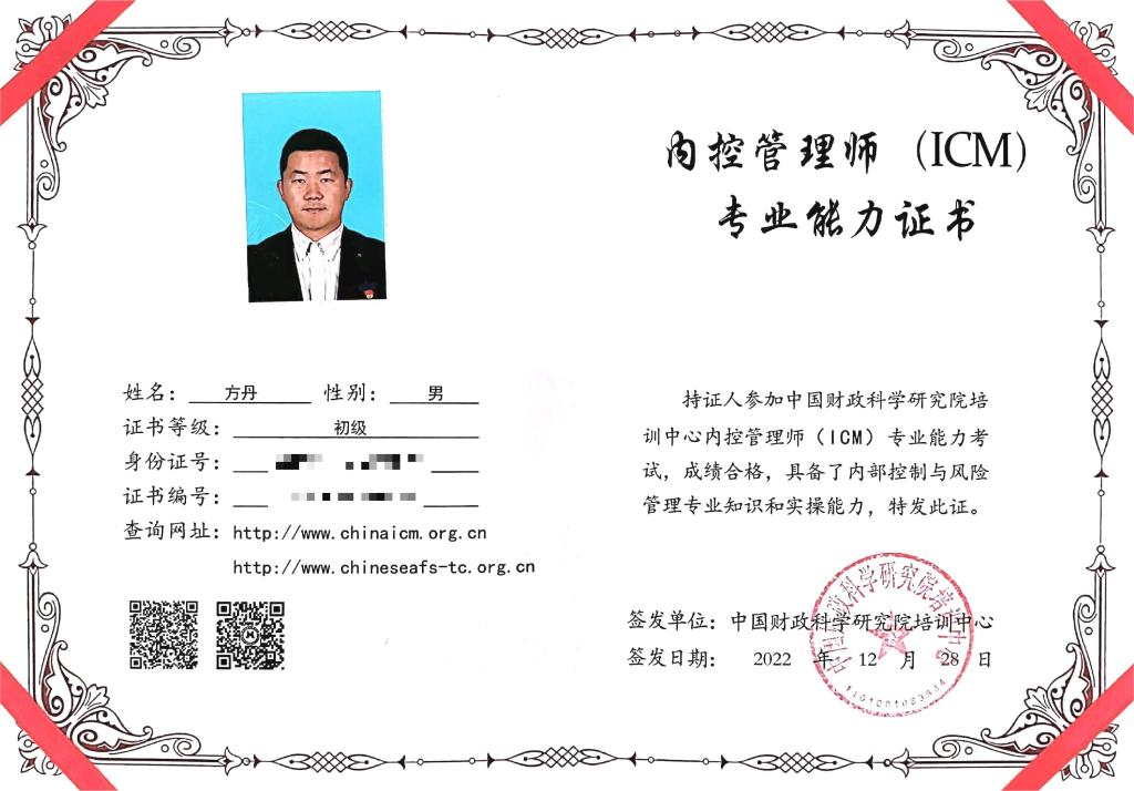 近日,必赢565net官网党委办/校长办/内控办业务专干方丹通过中国财政科学研究院内控管理师(ICM)专业能力考核,成绩优异,并获得内控管理师(ICM)资格证书。